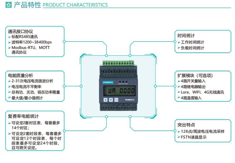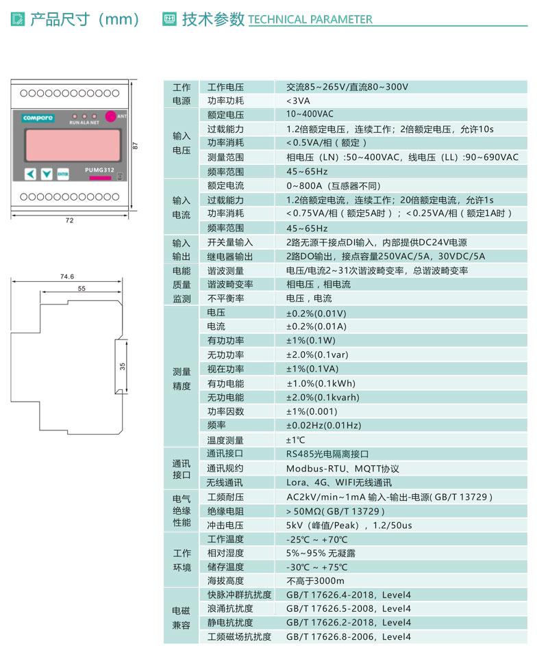 PUMG312系列三相導(dǎo)軌式智能電力能效終端采用DIN35mm 導(dǎo)軌式安裝結(jié)構(gòu)和LCD液晶屏顯示,可測4個三相回路的電參量、2~31次諧波、統(tǒng)計運行時間等,標(biāo)配1路RS485通訊接口,可通過Modbus -RTU或MQTT通訊協(xié)議實現(xiàn)儀表的網(wǎng)絡(luò)化管理。還可擴展4路開關(guān)量輸入和4路繼電器輸出,外接開口式互感器易于改造項目的施工。PUMG312具有體積小巧,精度高,可靠性好,安裝方便等優(yōu)點,多用于系統(tǒng)集成.