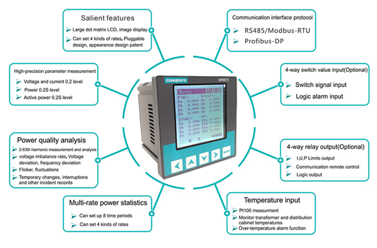 2-63 harmonic distortion rate; total harmonic distortion rate; crest factor; current K factor; voltage / current imbalance rate, flicker, voltage surge, dips, short interruptions |
