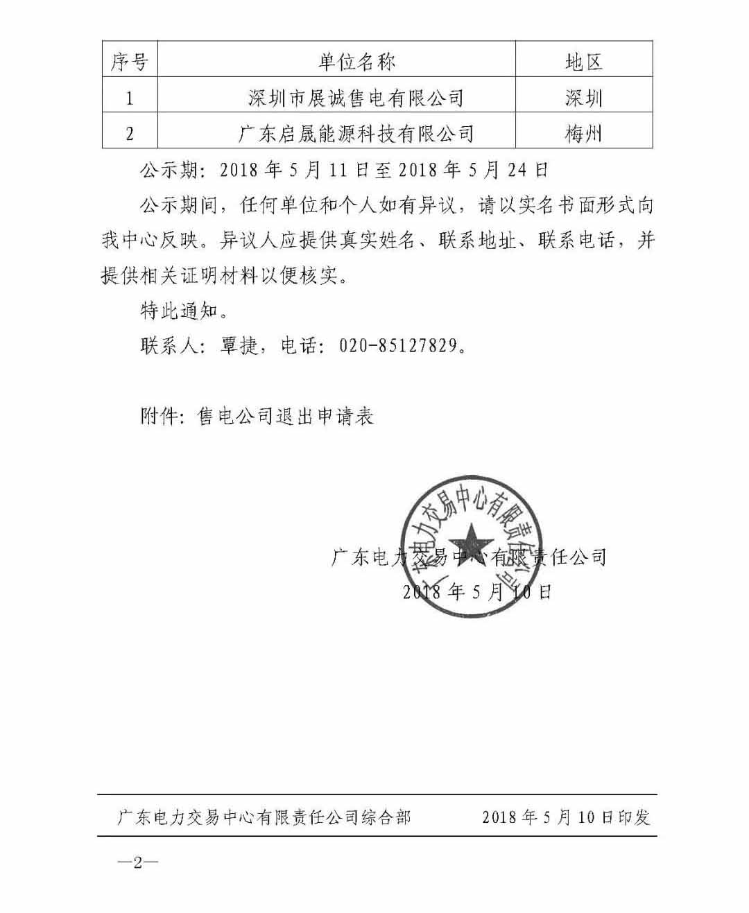 廣東電力交易中心日前發(fā)布了《關(guān)于公示深圳市展誠售電有限公司等2家售電公司退出電力市場的通知》,通知中稱,收到兩家售電公司退出電力市場的自愿退出申請,公示期為2018年5月11日至5月24日。這也是廣東首例售電公司退出事件。