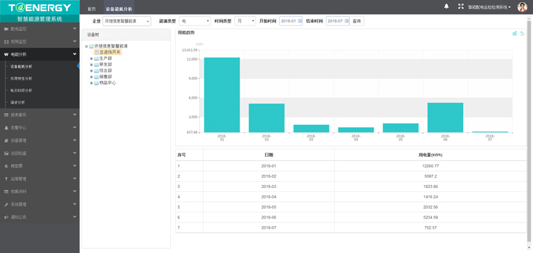 電能分析:能耗分析包括企業(yè)用能分析、部門綜合能耗、設(shè)備用能分析和電量指標(biāo)綜合分析這四類,將企業(yè)中各部門及各監(jiān)測點(diǎn)實(shí)際用能情況,通過不同的分析方式展現(xiàn)出來。