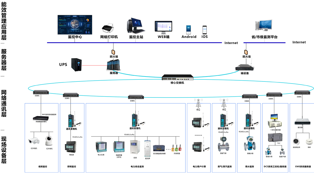T@Energy智慧管理能源系統(tǒng)基于B/S構(gòu)建,包括能效管理層、網(wǎng)絡(luò)通訊層、現(xiàn)場設(shè)備層。如下圖所示