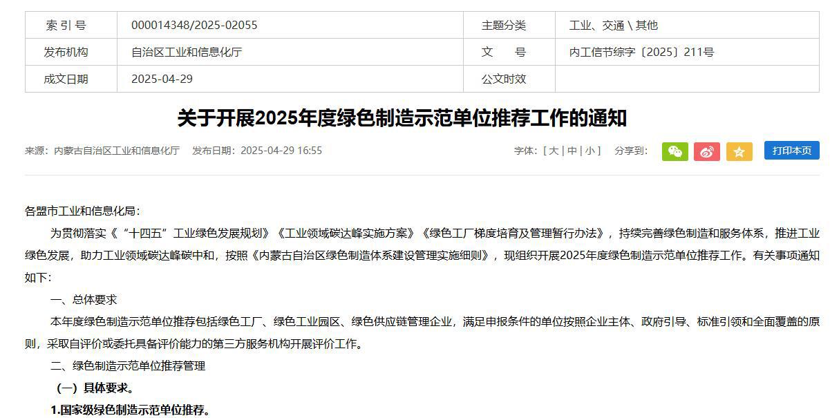 為貫徹落實《“十四五”工業(yè)綠色發(fā)展規(guī)劃》《工業(yè)領域碳達峰實施方案》《綠色工廠梯度培育及管理暫行辦法》,持續(xù)完善綠色制造和服務體系,推進工業(yè)綠色發(fā)展,助力工業(yè)領域碳達峰碳中和,按照《內蒙古自治區(qū)綠色制造體系建設管理實施細則》,現(xiàn)組織開展2025年度綠色制造示范單位推薦工作。本年度綠色制造示范單位推薦包括綠色工廠、綠色工業(yè)園區(qū)、綠色供應鏈管理企業(yè),滿足申報條件的單位按照企業(yè)主體、政府引導、標準引領和全面覆蓋的原則,采取自評價或委托具備評價能力的第三方服務機構開展評價工作。