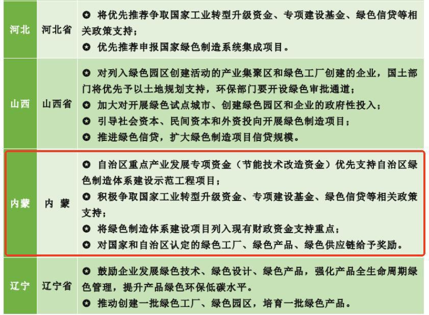 關于綠色工廠,不同的省市都有不同的鼓勵性政策補貼,下圖內蒙古省的政策補貼: