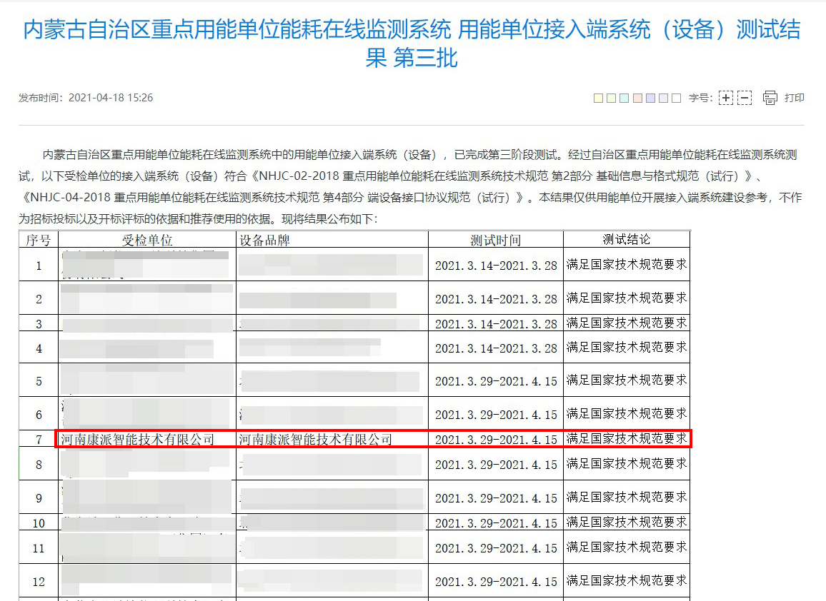 2021年4月18日,內(nèi)蒙古自治區(qū)重點(diǎn)用能單位能耗在線監(jiān)測(cè)系統(tǒng)中的用能單位接入端系統(tǒng)(設(shè)備),已通過第三階段測(cè)評(píng)。經(jīng)過內(nèi)蒙古自治區(qū)計(jì)量測(cè)試研究院測(cè)評(píng),康派智能能耗在線監(jiān)測(cè)端設(shè)備符合內(nèi)蒙古自治區(qū)重點(diǎn)用能單位能耗在線監(jiān)測(cè)系統(tǒng)技術(shù)要求。公布結(jié)果如下圖所示: