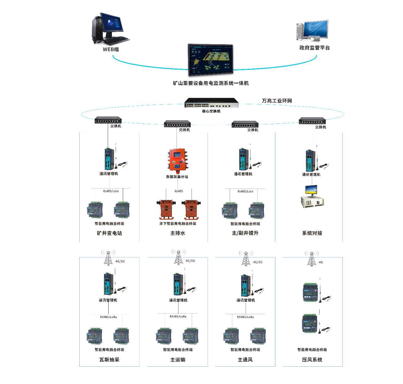 ·網(wǎng)絡(luò)層:以礦山內(nèi)部通訊管理機(jī)及相關(guān)網(wǎng)絡(luò)線路組成,通訊管理機(jī)用于末端計(jì)量表計(jì)和第三方監(jiān)測系統(tǒng)內(nèi)數(shù)據(jù)的采集、存儲(chǔ)、協(xié)議轉(zhuǎn)換并上傳至“管理一體機(jī)”或上級平臺(tái) 。根據(jù)監(jiān)測點(diǎn)位的數(shù)量和位置不同,可任意擴(kuò)展通訊管理機(jī)的數(shù)量。