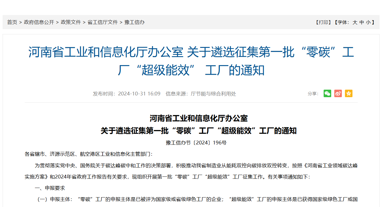 關(guān)于征集推薦河南省第一批“零碳”工廠 “超級能效”工廠的通知