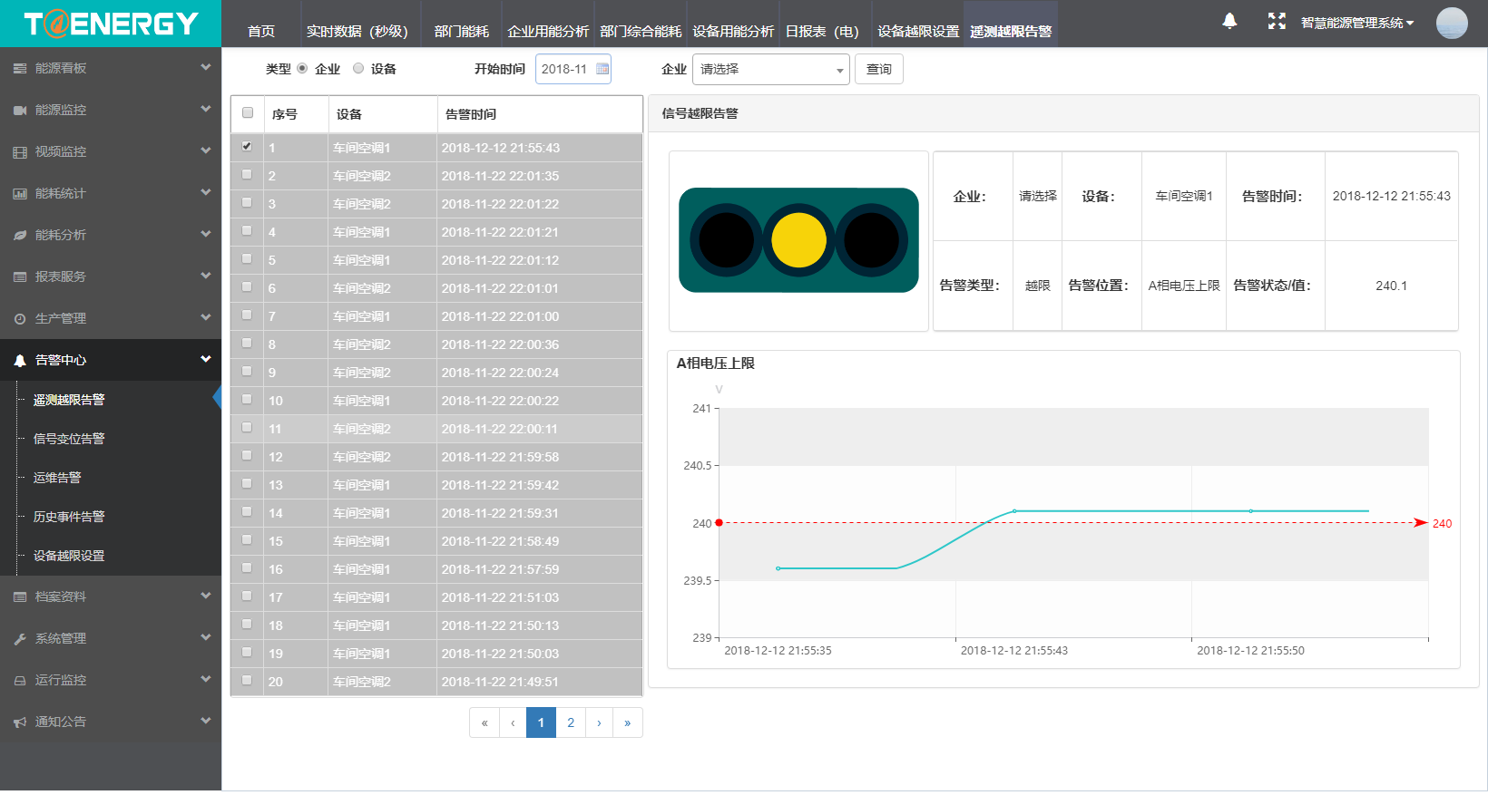 能源管理系統(tǒng)平臺告警及預(yù)警功能豐富,可以對事件、變位進(jìn)行告警和查詢。用戶通過對設(shè)備的運(yùn)行限值進(jìn)行設(shè)置,當(dāng)運(yùn)行參數(shù)觸發(fā)限值時(shí),系統(tǒng)就會(huì)自動(dòng)彈出報(bào)警信息。該信息包含時(shí)標(biāo),可以準(zhǔn)確發(fā)生的時(shí)間,為設(shè)備檢修和故障判斷提供了依據(jù)。